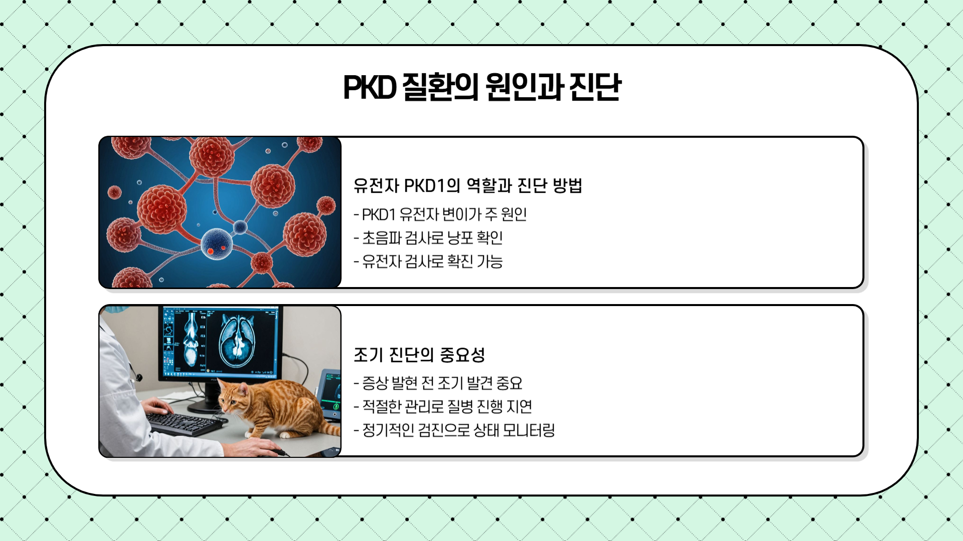 ✔ 🧪 유전자 검사 → PKD 유전자를 보유하고 있는지 혈액이나 타액으로 검사 가능